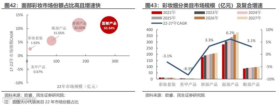 面部彩妆为彩妆市场主要品类,市场规模增长快于眼唇类彩妆,具备发展机会。从彩妆市场份额分布看,面部彩妆占据我国彩妆市场主要份额,欧睿数据显示,2022年中国面部彩妆市场份额为279.52亿元,占彩妆整体市场的50.34%;预计2027年市场规模达377.47亿元,占彩妆整体市场的54.26%。2)从彩妆细分行业市场规模增速看,面部彩妆市场规模增长快于眼部彩妆和唇部彩妆,欧睿数据显示,2017-2022年,中国面部彩妆市场份额CAGR为11.3%,眼部彩妆和唇部彩妆分别为5.5%/11.3%;2022-2027年,中国面部彩妆市场份额CAGR为6.2%,眼部彩妆和唇部彩妆分别为3.1%/3.3%。我国面部彩妆品类将加速发展,抢占更多彩妆行业市场份额,存在较大发展机会。