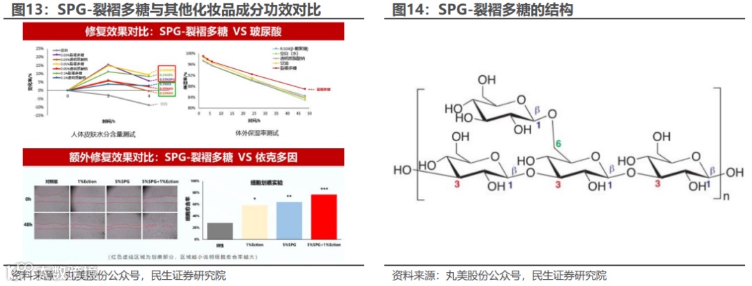 2)成分方面,公司研发出保湿、修复、抗衰功效优于透明质酸的天然发酵产物SPG-裂褶多糖。公司研发团队通过生物发酵技术,利用裂褶菌发酵制备得到SPG-裂褶多糖成分,该成分为三螺旋结构的β-葡聚糖,主打补水+修复双重功效。根据公司研发团队体内、体外试验结果,SPG-裂褶多糖的保湿效果、修复效果、抗衰老效果均优于透明质酸,具备优异的保湿、抗敏、抗炎、皮肤修复、抗皱等功效。截至23年末,公司已实现SPG-裂褶多糖成分的规模化量产;长期看,成分在公司产品中的推广和应用有望进一步提升公司产品竞争力。