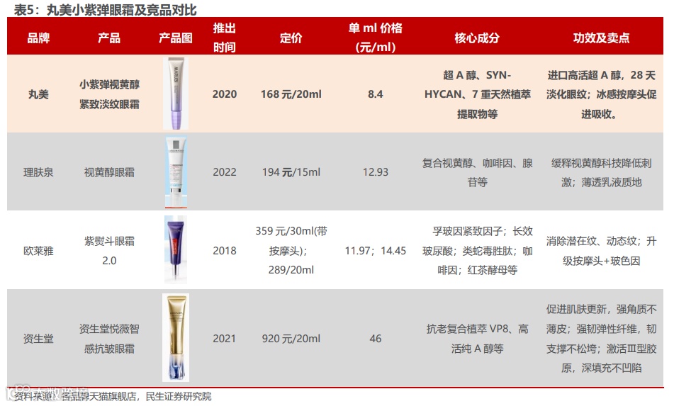 与竞品相比,理肤泉视黄醇眼霜和小紫弹眼霜相同主打视黄醇成分,理肤泉视黄醇眼霜的视黄醇成分为0.1%视黄醇溶液+0.05%缓释视黄醇溶液,视黄醇浓度低于小紫弹眼霜,且单ml价格为12.93元,高于小紫弹眼霜。欧莱雅紫熨斗眼霜与毕生之研日夜焕亮眼霜采用类似的按摩头设计卖点,与小紫弹眼霜形成竞争,但比较主打成分,小紫弹眼霜的视黄醇成分的抗老效果较玻色因成分更明显,小紫弹产品力更优。
