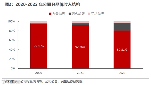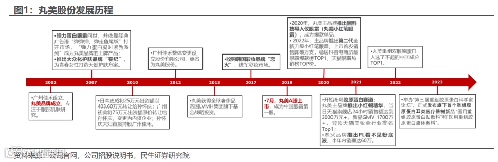 丸美股份是眼部护理赛道龙头,多品牌战略促成长。丸美股份成立于2002年,主要从事各类化妆品的研发、设计、生产、销售及服务。成立之初,公司深耕眼部肌肤研究,通过打爆“弹力蛋白凝时紧致眼精华”、“巧克力青春丝滑眼乳霜”、“白色之恋纯白淡黑眼霜”等多款眼霜产品,实现“丸美”主品牌破圈。2007年,公司推出大众化护肤品牌“春纪”,定位“天然食材养肤”,差异化丰富品牌矩阵;2017年,公司收购韩国彩妆品牌“恋火”,布局彩妆市场;2019年公司在上交所上市,成为“中国眼霜第一股”,并于同年全资收购恋火品牌;2020-2022年,公司推进丸美品牌及恋火品牌战略调整,通过精简产品品类和SKU数量,明晰品牌定位,打造丸美品牌的小红笔、蝴蝶眼膜以及恋火品牌的“看不见/蹭不掉粉底液”等大单品,驱动业绩高增。发展至今,公司已成为国内眼部护理及抗衰领域龙头企业,多品牌大单品逐步放量进一步打开成长空间。