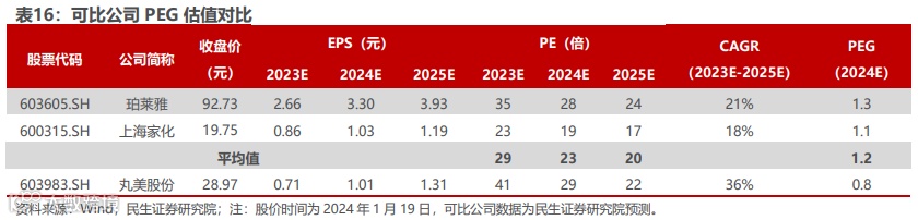 可比公司方面,选择与公司业务结构相似,多品牌驱动,同时布局彩妆及护肤赛道的上海家化与珀莱雅作为可比公司,计算得可比公司2023-2025年PE均值为29X/23X/20X,丸美股份PE高于可比公司均值。考虑公司2023-2025年归母净利润增速较快,2024年PEG低于可比公司PEG均值,具备投资价值。