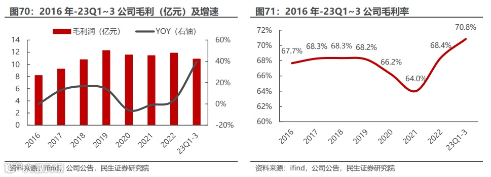 降本增效后毛利率进入快速提升通道,22年毛利率为68.40%。2016-2018年,公司毛利率整体稳定在68%的水平;2019-2021年毛利率有所下滑,主要系公司生产成本及运输成本略有上升所致;2021年-23Q1~3,公司毛利率进行快速上升通道,从64.0%提升至70.84%,主要系公司优化销售策略和成本管控,正常品的销售价格整体提升、活动品促销品的占比减少所致。