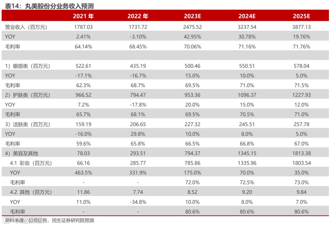 根据公司公告,公司主要产品品类分为眼部类、护肤类、洁肤类、美容及其他,由此我们基于公司2023年前三季度业绩情况以及各业务所含品牌增长情况,按以上分类对各产品品牌的营收及毛利率做出如下假设: