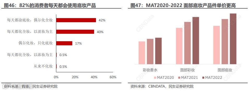 底妆相较色彩类产品门槛更高,同时具有高回购、高件单价等特点,为强实力新锐品牌的新机会点。从产品特点看,与口红等色彩类产品相比,底妆使用频率高、覆盖面积大且与脸部接触时间长,消费者对底妆在持久度、妆感、安全性、舒适性甚至功效性等方面有更高的要求,同时特别是对于粉底等产品,客户多以产品肤感为导向,一旦找到适合自身肤质的产品,消费者的回购度和忠诚度更高,粘性更强。从产品研发看,由于消费者对底妆的功能诉求极其多元,包含遮瑕、持妆、控油、轻薄、不暗沉等基本诉求,同时还在向抗氧化、抗衰、修护屏障等进阶功效进阶,生产能同时满足多元诉求的产品对原料开发、配方开发、生产工艺等技术提出极高的要求,产品制造门槛和件单价较色彩产品更高。综合来看,底妆相较色彩类产品生产门槛更高,同时具有高回购、高件单价等特点,为强实力品牌的新机会点。