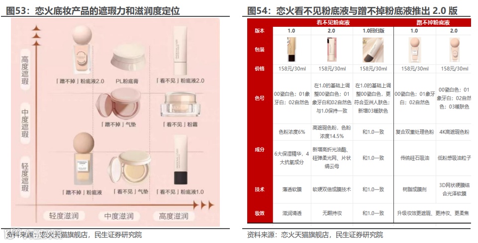 升级大单品粉底液,进一步提升产品功效,构建更为完善的底妆产品矩阵。2021年,公司针对干皮卡粉问题推出“看不见”粉底液,产品为奶霜质地、滋润度较高,主打上脸轻薄服帖,看不见痘印、红血丝、色斑等瑕疵;但由于产品仍存在轻薄型粉底液常有的遮瑕力不足的短板,2023年8月,恋火推出“看不见”粉底液2.0版,在保证1.0版产品清透自然妆效的同时,进一步提升粉底液的遮瑕力。此外,2023年12月,恋火复刻原版的清透配方,重新上架看不见粉底液1.0,满足喜欢自然妆效且对遮瑕力需求较弱的化妆群体的需求。针对油皮推出的“蹭不掉”粉底液为2022年6月上新1.0版,2023年3月升级2.0版,升级版使用4K高遮瑕色粉加乘低粉感吸油粒子,持妆度和遮瑕力同步提升。截至目前,恋火底妆产品包含粉底液、气垫、粉底膏、粉霜等品类,覆盖高、中、低三种层次的遮瑕力和滋润度,能够满足消费者多元妆效需求。