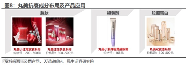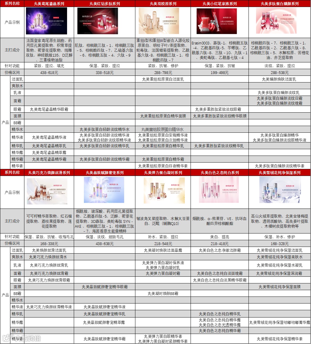 具体来看,1)鸢尾鎏晶系列:线下高定专供系列,产品价格438~618元,核心成分为法国皇家鸢尾原生细胞,主打紧致塑形功效;2)红钻多肽系列:原多肽蛋白系列升级版,产品价格338~518元,主打保湿、紧致功效;3)双胶原系列:应用公司自研全人源双胶原蛋白原料,主打紧致肌肤、抗皱淡纹、屏障修复的功效,产品定价288~798元;4)小红笔家族系列:以小红笔眼霜为核心产品,主推25%高浓度的6D胜肽成分,起保湿修复、淡纹紧致的功效,系列产品定价区间为199~498元;5)多肽蛋白臻颜系列:匹配专研四重胜肽配方,对抗肌肤松弛老化,产品定价288~528元;6)巧克力焕颜丝滑系列:核心成分为可可籽精华,搭配多重鲜活植物精华,实现保湿抗老,产品定价168~338元;7)晶致赋颜奢宠系列:应用CelCap技术,主打抗衰抗皱功效,产品定价438~638元;8)弹力蛋白凝时系列:采用丸美专利水解弹力蛋白,主要功效为修复、提拉紧致,产品定价218~548元;9)白色之恋纯白系列:主打美白提亮,产品定价218~418元;10)雪绒花纯净保湿系列:主要功效为补水保湿和屏障修护,产品定价168-328元。