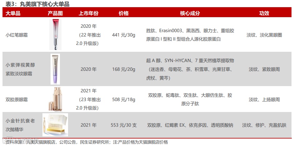 丸美大单品应用公司核心科技,产品力卓越。目前市场上主流抗衰成分包含胜肽、视黄醇、胶原蛋白、玻色因四种,丸美已研发出胜肽、视黄醇、胶原蛋白三种。胜肽是几个或数十个氨基酸序列结合形成的活性物质,分子量低,较容易被皮肤所吸收,主要应用于丸美小红笔系列;视黄醇(即维生素A),通过加速皮肤细胞的新陈代谢,促进皮肤中胶原蛋白的合成,是第一种被美国FDA批准用于皮肤抗衰老的成分,目前主要应用于丸美小紫弹眼霜;胶原蛋白通常以小分子存在于护肤品中,通过水解生成的寡肽起抗衰作用,能够影响皮肤角质形成细胞和成纤维细胞里部分基因的表达,诱导胶原蛋白以及透明质酸的产生,抗衰效果相较于胜肽、视黄醇更优,目前丸美主要将自研的重组胶原蛋白应用于双胶原系列等产品中。