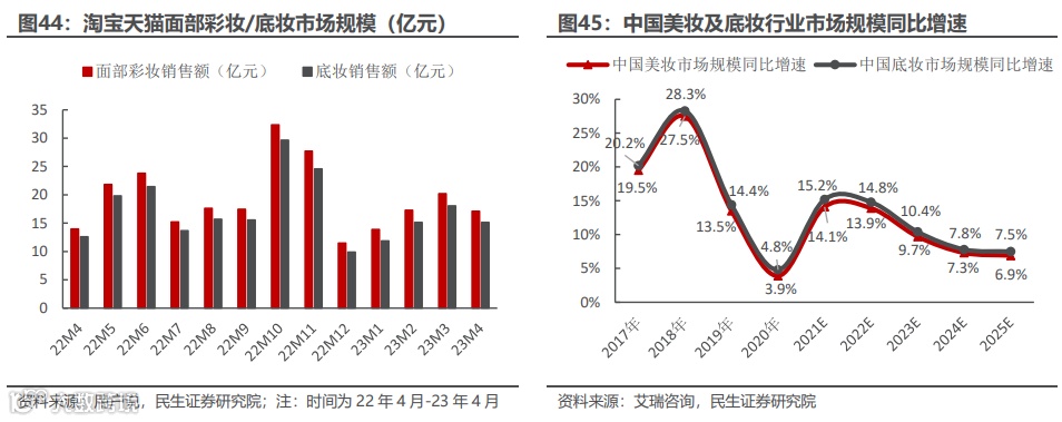 聚焦面部彩妆细分赛道,底妆市场的基本盘体量大且增长韧性较强,为彩妆赛道的高价值板块。底妆为我国面部彩妆最大的细分市场,根据用户说数据,MAT2023(22年5月-23年4月)淘宝天猫平台面部彩妆GMV为236.0亿元,其中底妆品类贡献210.6亿元,占比~89%;同时,艾瑞咨询数据显示,我国底妆市场规模2016年-2021年增速连续跑赢美妆市场,并预计21-25年仍以10.11%的复合增速维持增长(高于美妆整体行业9.42%),增长韧性较强,发展潜力凸显。