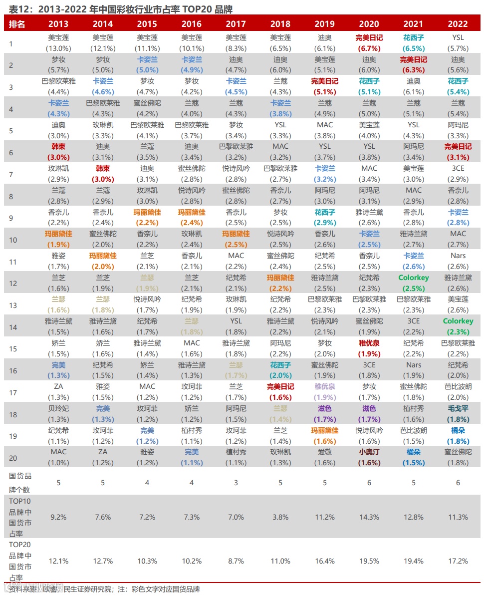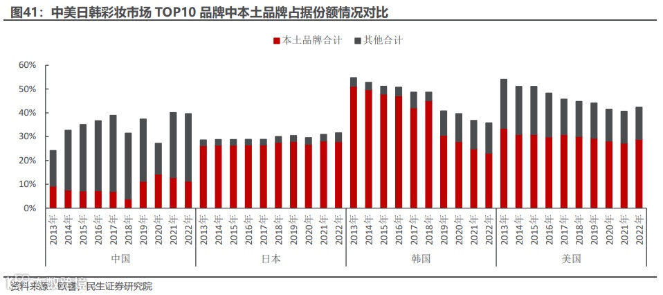 国货整体在彩妆行业的市占率持续提升,龙头增长空间广阔。根据欧睿数据,2013-2022年,中国彩妆市场市占率TOP20品牌中国货品牌的数量整体维持在5个的水平,22年挤进TOP20的国货品牌共6个;市占率方面,中国彩妆市场CR10从2013年的43.2%降至2022年的39.7%,其中国货占据份额从2013年的9.3%升至2022年的11.3%;CR20从2013年的57.1%升至2022年的61.4%,其中国货占据份额从2013年的12.1%升至2022年的17.2%,头部国货品牌争夺到更多的头部市场份额。此外,对比海外市场,中国彩妆行业市占率前十品牌中,本土品牌合计市场份额水平较低,2022年中国彩妆前十品牌中本土品牌合计市占率为11.3%,较日本(27.9%)、韩国(23.1%)、美国(28.8%)仍有较大提升空间,看好未来国货品牌市占率提升,以及国货彩妆龙头在该上升期中的增长空间。