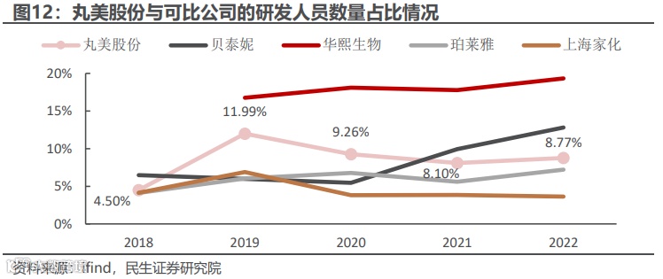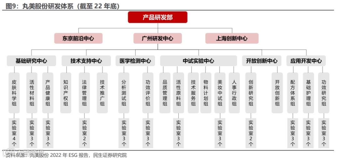 重视研发,持续加大研发投入,搭建完备研发体系和团队。公司自成立以来致力于化妆品研发,构建完备研发体系,不断加大科研人才引进力度,提升自主研发实力。1)研发体系方面,公司进行全球化科研布局,在国内外设立上海创新中心、广州研发中心和东京前沿中心三大研发中心,其中广州5C中心为全球最大的眼部肌肤研究中心,总建筑面积高达5万平方米,下辖基础研究中心、应用开发中心、评价测试中心、开放创新中心等五大中心,并设有多个实验室平台,主要聚焦于技术研究;东京前沿中心主要负责收集亚洲的技术资源、原料资源、供应链资源、产品资源等,赋能企业找到亚洲最新的护肤趋势信息;上海科创中心主要负责品牌孵化以及赋能生态链的建设。