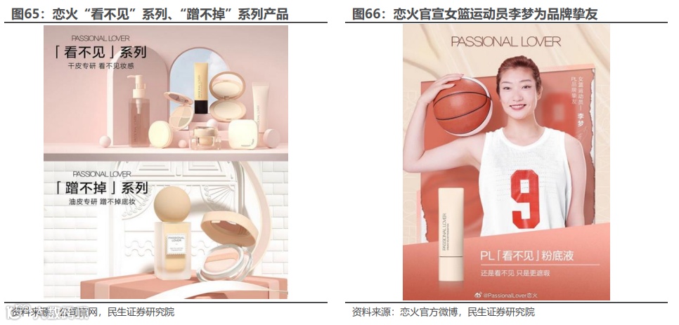 产品命名融入产品特点,快速建立消费者印象,提升产品传播能力。恋火旗下干皮专研产品取名“看不见”系列、油皮专研产品取名“蹭不掉”系列,“看不见”和“蹭不掉”直击干皮妆后卡粉、油皮妆后脱妆的痛点,直接向消费者传递产品功效,缩短消费者思考路径,能够更快将产品植入消费者的心智中。此外,2023年11月,恋火官宣女篮运动员李梦为品牌挚友,立足“同款打球不脱妆底妆”,将产品的持妆性和无暇妆感嵌入打球场景,进一步具象产品功效,提升消费者对产品的认知,助力产品市场推广。