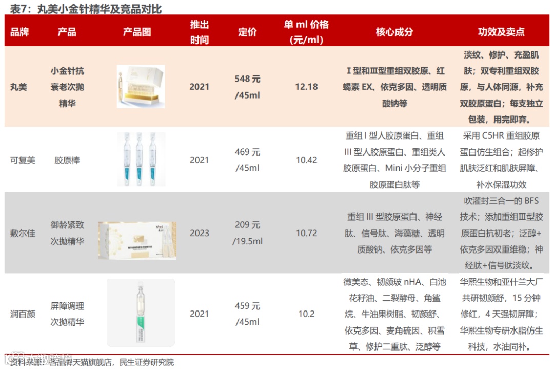 4)小金针次抛精华:市场中次抛精华多定位补水保湿、敏肌修护,而丸美小金针次抛精华主打敏肌抗老,定位差异化竞争市场。此外,小金针次抛精华采用重组双胶原蛋白技术,同时补充Ⅰ型和Ⅲ型重组胶原蛋白,高效抗衰;搭配专利红蝎素EX、依克多因、透明质酸纳,在抗皱淡纹的同时实现修护维稳、补水保湿功效。