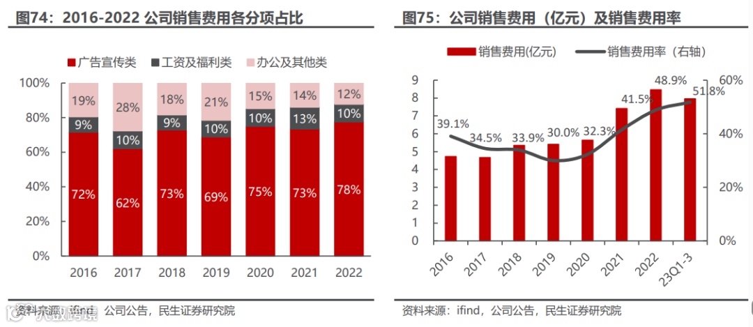 销售费用主要为广告宣传支出、工作及福利支出、办公及其他类支出,22年销售费用率为48.86%。2016-2022年,公司销售费用从4.72亿元升至8.46亿元,对应销售费用率从39.09%提升至48.86%,主因公司线上推广费用及职工薪酬、办公费用增长。23Q1~3,公司销售费用为7.95亿元,同比增48.78%;销售费用率为51.78%,同比+5.03pct,主要系公司处于线上渠道转型期,广告宣传费用增加。