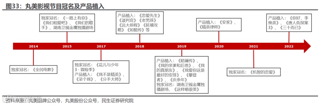 冠名影视节目,植入产品广告,扩大品牌推广面。在传统媒体方面,丸美通过节目冠名、广告植入等形式进行品牌营销。2014-2018年,丸美传媒营销措施主要聚焦电影、电视剧及综艺冠名,例如14年独家冠名《全民电影》电影,15年独家冠名《一路上有你》、《我们相爱吧》等综艺节目,18年独家冠名《恋爱先生》、《谈判官》、《老男孩》等热门剧集。随丸美2019年开始线上转型,品牌在传统媒体平台的营销手段逐渐转为电视剧产品植入,例如19年在古装大剧《皓镧传》中植入丸美弹力蛋白眼精华;热播剧集《我爱你这是最好的安排》的主角使用丸美弹力蛋白凝时紧致系列产品为产品引流。