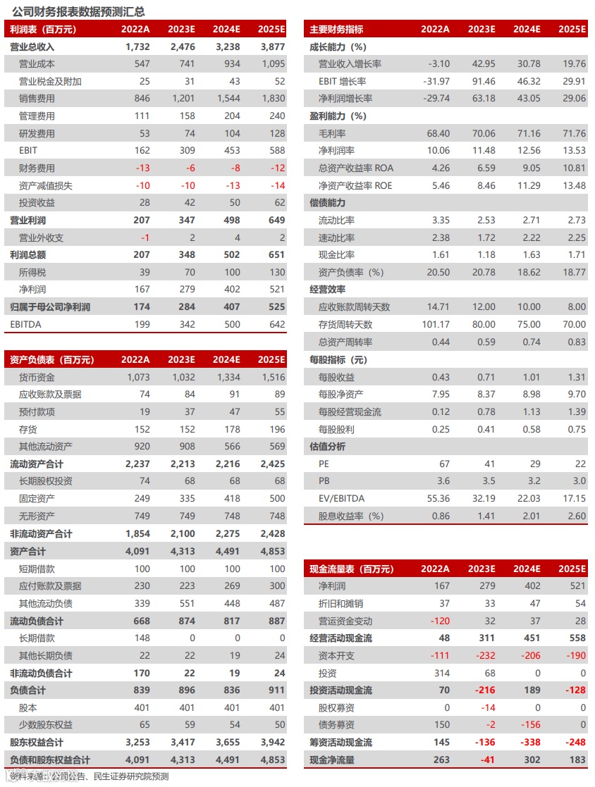 美容及其他:包含彩妆(恋火)及其他业务两类收入,其中1)彩妆:根据公司公告,23H1恋火品牌实现收入3.07亿元,同比增长211.42%;根据久谦数据,23H2恋火品牌在天猫、抖音渠道合计实现GMV 3.29亿元,同比增长154.24%,23年恋火品牌在主要电商平台以较高的增速持续增长,同时考虑差异化定位细分底妆赛道,并积极开拓和升级契合消费者需求的产品,我们预计2023-2025年恋火有望延续高增,彩妆业务营收分别为7.86、13.36、18.04亿元,同比增长175%、70%、35%;毛利率方面,随公司推出精油粉饼等客单价更高的产品,毛利率有望提升,预计2023-2025年彩妆类业务毛利率分别为72.0%、72.5%、73.0%。2)其他:预计2023-2025年收入分别为852、920、984万元,同比增长10%、8%、7%,毛利率分别为80.6%、80.6%、80.6%。