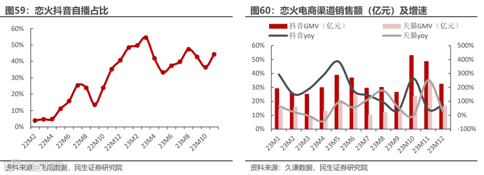 23年恋火线上销售高增,线上渠道布局成效显现。飞瓜数据、久谦数据显示,23年恋火在电商渠道展现出较好的销售表现,抖音、天猫平台分别实现GMV 4.05、2.08亿元,分别同比增长138%、37%;且品牌自播能力大幅提升,自播销售占比从22年2月的3.94%提升至23年11月的44.25%,品牌线上渠道布局成效显现,未来可期。