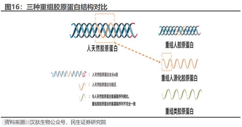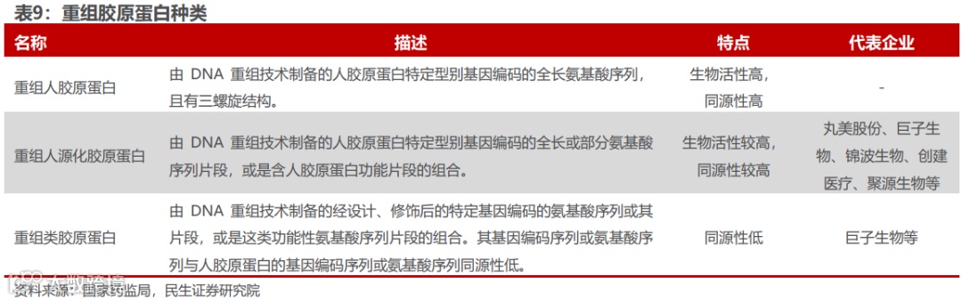 重组胶原蛋白分为重组人胶原蛋白、重组人源化胶原蛋白、重组类胶原蛋白三类,丸美重点布局重组人源化胶原蛋白。目前重组胶原蛋白的分类主要有3种:1)重组人胶原蛋白:指由DNA重组技术制备的人胶原蛋白特定型别基因编码的全长氨基酸序列,且有三螺旋结构,结构与天然胶原蛋白一致;目前市场暂未出现重组人胶原蛋白。2)重组人源化胶原蛋白:由DNA重组技术制备的人胶原蛋白特定型别基因编码的全长或部分氨基酸序列片段,或是含人胶原蛋白功能片段的组合,与人胶原同源性较高,为目前市场中重组胶原蛋白赛道玩家主要布局的原料,例如丸美股份(重组双胶原蛋白、医用重组III型胶原蛋白)、巨子生物(重组I型/III型人胶原蛋白)、锦波生物(重组III型人源化胶原蛋白)、创建医疗(重组人源化胶原蛋白)。3)重组类胶原蛋白:由DNA重组技术制备的经设计、修饰后的特定基因编码的氨基酸序列或其片段,或是这类功能性氨基酸序列片段的组合。其基因编码序列或氨基酸序列与人胶原蛋白的基因编码序列或氨基酸序列同源性低,与人胶原同源性低。