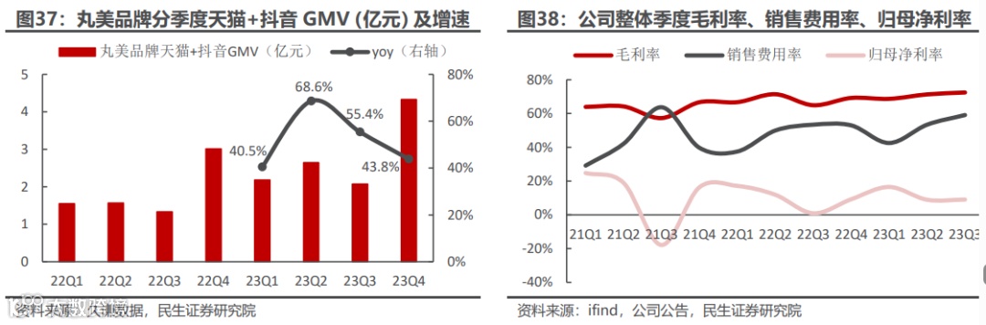 品牌销售持续高增,规模效应下盈利能力有望持续优化。基于成熟的“曝光→种草→转化”的闭环营销模式,丸美品牌坚持营销费用投放,拉动品牌销量与品牌势能提升;根据公司公告及久谦数据,丸美品牌23年在线上渠道持续高增长,23H1丸美品牌抖音快手同比+130%,天猫旗舰店同比+28%;23Q3/Q4天猫+抖音合计实现GMV 2.07/4.33亿元,同比+55%/44%。中长期来看,持续积累的品牌势能有望转化为长期增长动能,费用投放效率提升,品牌将逐步从收入快速提升的扩规模阶段进阶至利润快速提升的提盈利阶段,实现收入与利润的高增。