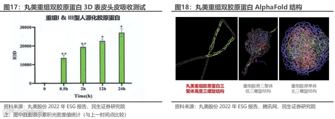 丸美重组双胶原蛋白具有与人体胶原蛋白氨基酸序列100%同源、高稳定性高活性等优势。2021年,公司发布与暨南大学基因工程药物国家工程中心合作研究、开发制备的重组双胶原蛋白,该胶原蛋白具有多方面的先进性:1)氨基酸序列与人I型和III型胶原蛋白结构域序列一致,安全性更高;2)利用c-pro扣环技术,以 1:1 的配比嵌合I型和III型胶原蛋白功能结构氨基酸序列,攻克两种胶原蛋白无法同时同补的难题,使皮肤可以主动透皮吸收;公司表皮模型EpiKutis试验结果显示,丸美的重组I&III型胶原蛋白在0.5H、2H、12H、24H任一时间点荧光物质的累积量显著高于前一时间点,丸美重组双胶原蛋白具有良好的透皮吸收性能;3)通过独有翻译暂停技术,帮助胶原蛋白形成正确的三螺旋结构,使得最终产出的重组胶原蛋白在“序列”和“结构”上更接近人体胶原蛋白,提升胶原蛋白的稳定性和活性。
