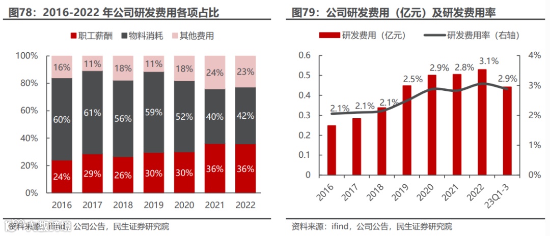 研发费用主要为职工薪酬、物料消耗、其他费用,22年研发费用率为3.06%。2016-2022年,公司研发费用从0.25亿元提升至0.53亿元,对应研发费用率从2.07%提升至3.06%,研发投入持续加大主要系公司将技术创新和新产品开发作为公司发展战略的核心,不断开发新技术和新产品以巩固市场地位。23Q1~3,公司研发费用为0.44亿元,同比增18.56%;研发费用率为2.88%,同比-0.38pct。