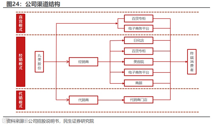 起家于线下,以线下经销为主要销售模式。早期,丸美主要借助经销商网点资源快速扩大销售范围,提升品牌市占率。根据公司招股书,2013-2018年,公司经销商数量从145个增至186个,经销商终端网点数量从14368家增至16555家,经销网络快速扩大,2018年末已实现全国31个省、自治区和直辖市的全覆盖。2019年后,公司逐步完善线上渠道,布局抖音、快手、小红书等内容电商。截至23H1,公司已形成线下经销为主、线上直营与经销并行的销售模式,建立覆盖线下日化专营店、百货商场专柜、美容院,及线上平台电商(天猫、京东、唯品会等)、内容电商(抖音、快手、小红书等)等多种渠道的销售网络。