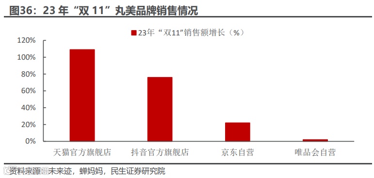 自播、达播带货,完成流量到销量的转化。丸美建立起张凯毅、骆王宇等头部流量到旗舰店自播带货的传播矩阵,推动产品转化。根据未来迹、蝉妈妈等数据显示,23年“双11”,丸美天猫官方旗舰店实现销售额1.27亿元,同比+109%;丸美抖音官方旗舰店实现销售额1亿元+,同比+76%;京东自营同比增长约22%;唯品会自营同比增长2%,主流电商渠道直营店均实现增长。此外,23年“双11”期间,丸美与超头李佳琦展开合作,在其直播间销售二代小红笔胜肽眼霜,单款产品预售额约0.24亿元;累计138名“达人”带货丸美产品,整体销售额同比+53.2%,其中头部达人“超级丹”销售额超2000万元。