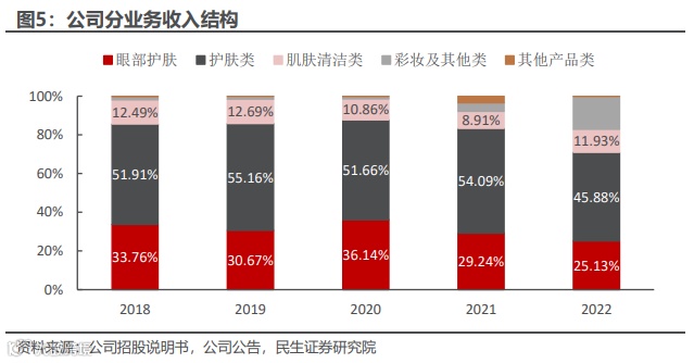 分产品看,护肤品类贡献超 50%的营收。公司的主要产品可以分为眼部护肤类、肌肤清洁类、护肤类(膏霜乳液)以及护肤类(面膜)、彩妆及其他类,其中护肤类产品为公司主要收入来源;18-22 年,眼部护肤、护肤类两大护肤品类合计实现营收 13.50/15.46/15.32/14.89/12.30 亿元,对应合计营收占比为 85.67%/ 85.82%/ 87.80%/ 83.33%/ 71.01%。