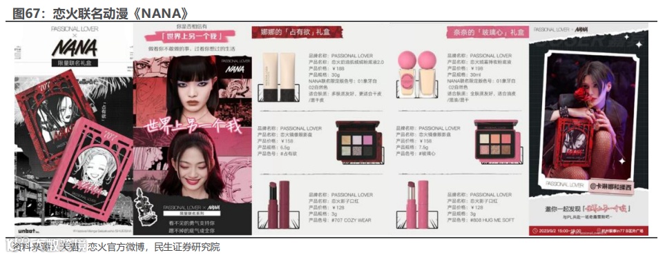 借势知名动漫IP传达品牌价值,精准触达潜在消费圈层。近年来,动漫联名成为一种美妆营销趋势,各大美妆品牌陆续推出联名礼盒,如Romand以美乐蒂与酷洛米为主角打造多款彩妆、橘朵与迪士尼合作推出时空邮差礼盒、皮可熊携手合作韩国动画片《小企鹅Pororo》中的LOOPY。2023年9月,恋火联名动漫《NANA》,根据动漫主角的人物特点推出两款限定联名系列——娜娜“占有欲礼盒”与奈奈“玻璃心礼盒”;同时基于娜娜与奈奈的人物关系,设定主题“世界上另一个我”,将“看不见的勇气支持你,蹭不掉的底气成全你”作为宣传语,宣扬女性力量,触达更加细分群体。