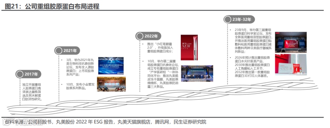此外,2022年,丸美成立专有重组胶原蛋白“产学医研检”一体协同化平台,通过建立内部完整的基础研究、应用开发、医学检测、中试实验、应用推广的成熟运行系统,同时集成外部“学研医检”的扎实科研资源优势,加速重组胶原蛋白技术从基础研究到产业发展的转化。根据丸美2022年第二届重组胶原蛋白抗衰老论坛,丸美计划在10年内投入10亿进行重组胶原蛋白的持续研发,2026年预计推出重组胶原蛋白水光针医美产品,2030年推出重组胶原蛋白人工角膜和人工关节,2032年推出第一款重组胶原蛋白3D打印人体器官,逐步实现丸美重组胶原蛋白的全产业链布局。