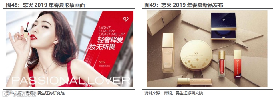 产品定位错位主流趋势+外部环境影响驱动品牌两次转型。1)第一次转型(2018年):公司于2017年控股恋火品牌,2018年开启恋火的首轮全新品牌战略升级,通过深度合作科丝美诗、蔻丝恩、科玛、PurplePatch、BOUNDARY DESIGN等多家行业优秀供应商,签约奢侈品牌御用设计师,启用顶尖的韩国团队、韩国模特、韩国创意等,品牌重新定位轻奢韩系彩妆品牌。但由于近年来韩娱文化影响减退以及国潮崛起,恋火首次转型并未获得良好的市场反应。
