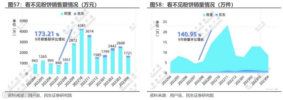 合作头部达播增加产品曝光,推进产品销售。恋火合作具有较大粉丝基础的“达人”进行直播带货,增加品牌产品露出的同时促进产品销售,例如天猫平台绑定超头李佳琦,抖音平台合作张凯毅、潘雨润等头部主播。2022年9月,恋火与李佳琦携手共创新品“看不见气垫”和“看不见精油粉饼”,并通过李佳琦直播间带货,驱动产品销售额和销量同步提升;根据用户说数据,22年9月,恋火粉饼在阿里+京东双平台销售额环比+173.21%,销量环比+140.95%。