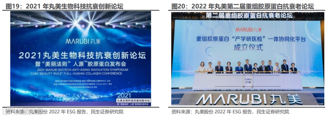 举办重组胶原蛋白论坛,搭建重组胶原蛋白“产学医研检”一体协同化平台,助力重组胶原蛋白全产业链发展。近年来,丸美持续通过举办论坛会议的方式,分享重组胶原蛋白的最新研究成果及其领域应用,推进行业技术升级和创新;2021年3月,举办首届生物科技抗衰创新论坛,发布全人源胶原蛋白;2022年10月,举办第二届重组胶原蛋白抗衰老论坛,发布采用丸美全人源双胶原蛋白技术专利的丸美脆皮冻干面膜、丸美胶原绵绵杯、丸美胶原奶油霜三大新品;2023年9月,举办以“向世界 致未来”为主题的第三届重组胶原蛋白科学家论坛,发布医用重组胶原蛋白贴敷料、医用重组胶原蛋白敷料两种Ⅱ类医疗器械系列新品。