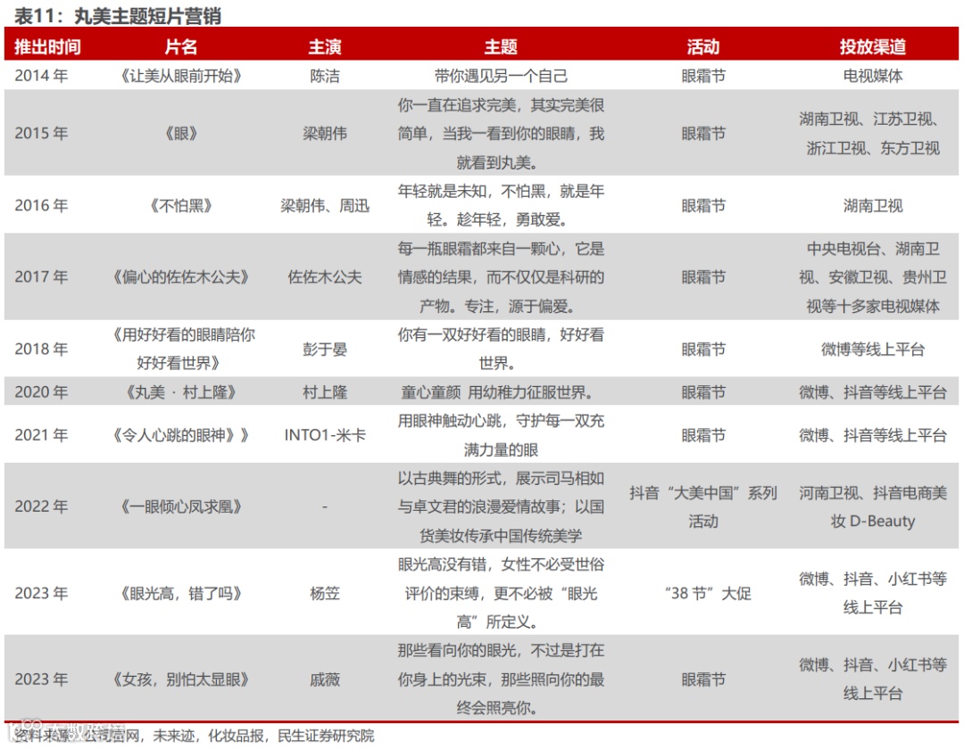 以眼霜节等活动为支点,推出“态度短片”,引发话题热议,以情感共识增强品牌认同感。丸美主要通过在眼霜节活动、“38”节大促等活动节点推出主题短片,向消费者传递“美、从眼前开始”的品牌情感理念,并引发话题热议,扩大营销范围。丸美于2014年举办“我 EYE 用王牌”首届眼霜节,至今已开展至第十届;在历届眼霜节中,丸美围绕“眼”推出多个态度短片诉说品牌故事,例如15年推出《眼》、16年推出《不怕黑》、18年推出《好好看的眼睛》、21年推出令人心跳的眼神》、23年推出《女孩,别怕太显眼》等,其中梁朝伟主演的三分钟广告《眼》营销效果突出,播出8天内影响受众14亿+人次,广告价值超3.5亿,传播媒体价值ROI达到1:14。