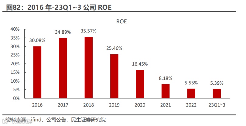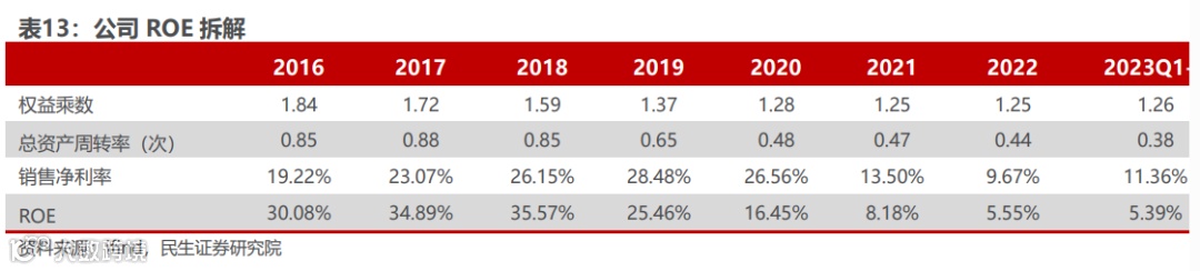 2022年公司权益收益率为5.55%。2016-2022年,公司ROE从30.08%降至5.55%,分拆来看ROE下滑主要系销售净利率和总资产周转率出现较大波动,其中销售净利率从2016年的19.22%下滑至2022年的9.67%,总资产周转率从2016年的0.85次下滑至2022年的0.44次。