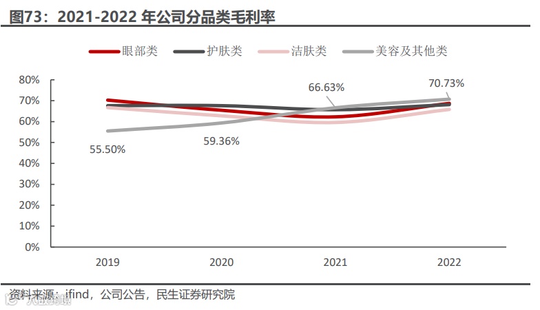 分业务看,护肤类毛利率较为稳定,彩妆类毛利率快速提升。19-22年,公司护肤类目毛利率较为稳定,分别为67.64%/67.63%/65.69%/68.13%;彩妆类目毛利率快速增长,从19年的55.50%提升至22年的70.73%,成为毛利率最高的类目;眼部类目和洁肤类目毛利率小幅下滑,分别从19年的70.28%/66.71%降至22年的68.74%/65.82%。