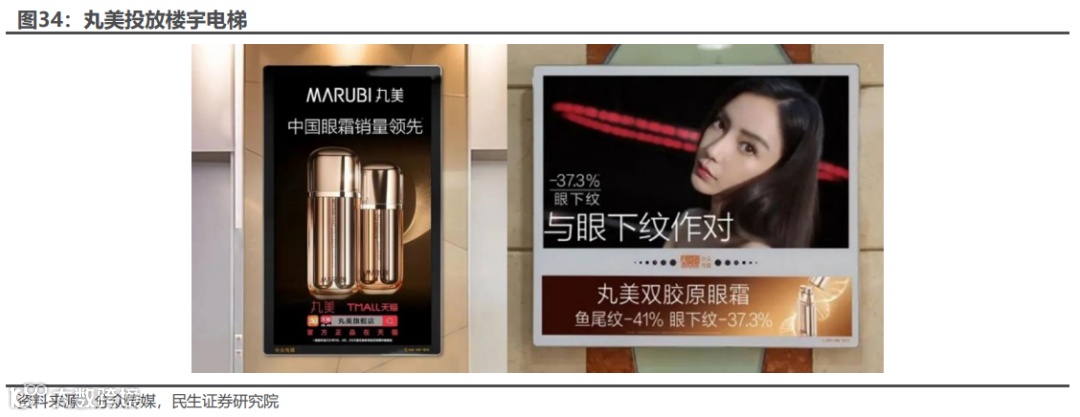 投放梯媒、户外大屏等渠道,实现产品内容深渗透、品牌用户强收割。丸美通过投放楼宇电梯、万达院线、机场、户外大屏、高铁站等平台,加强线下消费群体宣传。2022年,丸美合作分众传媒、新潮传媒合作,将丸美双胶原眼霜“与时间作对”TVC在168个城市、26万+社区进行战略投放,覆盖3大核心广告场景,精准触达超4亿都市主流人群;“38”节期间,利用全国200万块广告屏,战略投放100城,分众传媒累计196亿人次曝光,新潮传媒累计5.5亿人次曝光,共计高达200亿+人次。