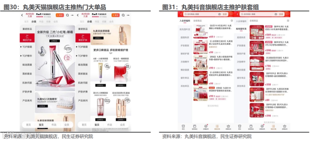 坚定推进分渠分品策略,渠道精细化运营。2021年,公司开始实行分渠分品策略,根据线上线下的销售场景和人群画像推出不同货盘,且不同平台各有侧重,截至23年3月线上线下产品区分度达60%~70%。线上渠道方面,1)天猫:消费者在挑选产品时已产生具体需求,因此主推热门大单品,如小红笔眼霜、小金针次抛等,与竞品争夺存量需求;2)抖快:推荐逻辑为基于视频内容和用户标签进行精准推荐,因此流量转化率和连带率更高,丸美在该渠道更侧重售卖套组;截至24年1月11日,丸美抖音官方旗舰店销量第一的SKU为四抗2.0套组,销量超15万。线下渠道方面,1)CS、百货渠道:由于丸美线下客群多为35~50岁的消费者,财富积累较年轻群体更充足,具有高粘性、高客单价的特征,丸美在线下CS、百货渠道主推高定系列,如晶致赋颜奢宠系列、鸢尾鎏金系列,客单价约500~600元;2)专业线渠道:主推功能性护肤品,如冰柔安肤水漾修护精华油、富勒烯青春环采雪融霜奢享套组;3)KKV与商超渠道:主推小份单品,如重组胶原蛋白次抛精华2支装。