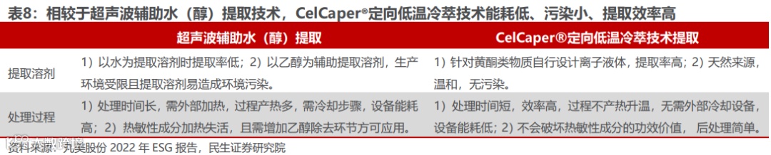 1)技术方面,公司独家创新开发CelCaper®定向低温冷萃技术。CelCaper®定向低温冷萃技术针对性设计和使用天然的离子液体代替传统溶剂,结合高压电场破壁技术,可在低温下使细胞膜和细胞壁的通透性瞬间发生变化,实现细胞中的活性物定向、高效地经由特定离子液体溶出,提高目标活性物的提取率。相较于传统植物提取技术,CelCaper®定向低温冷萃技术具备提取效率高、提取时间短(毫秒级)、提取精准度高、能源消耗少等优势,为公司制备绿色、温和、高活、高科技的活性原料提供可能。目前公司将该技术运用于木棉花提取物的提取中,根据公司研究成果,CelCaper®定向低温冷萃技术相较传统超声波辅助水(醇)技术,可使木棉花提取物中的黄酮含量提高56.8%,大幅提升提取率。
