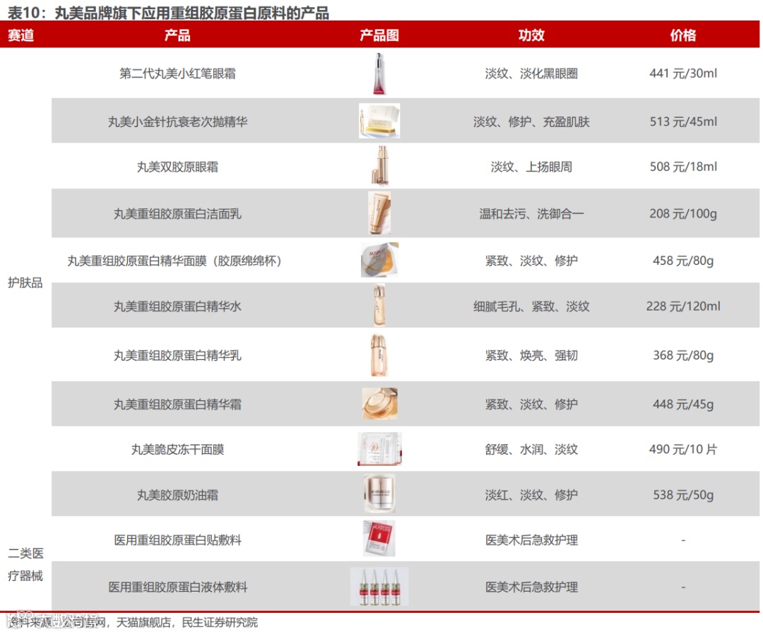 重组胶原蛋白具备优异的抗衰功效,丸美前瞻性把握重组胶原蛋白新趋势。重组胶原蛋白具有较强的抗氧化和清除自由基作用,能够显著减少衰老皮肤病理损伤,增加皮肤弹性纤维数量并改善弹性纤维形态,具有延缓皮肤衰老的功效。丸美品牌成立以来深耕抗衰主线,布局重组胶原蛋白成分有助于进一步提升产品抗衰效果。由此,公司基于“功能活性蛋白研究平台”,前瞻性进行“重组胶原蛋白”研发,2021年与暨南大学及基因工程药物国家工程研究中心成功共研共创出“重组人源化胶原蛋白”,并逐步推出小金针次抛精华等10个应用该重组胶原蛋白原料的新品,夯实品牌在抗衰领域的龙头地位。