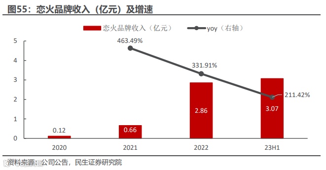 新锐彩妆品牌,以高质和极简的“底妆心智”突围市场,品牌收入持续提升,第二增长曲线逐步明晰。根据公司公告,2022年恋火品牌实现收入2.86亿元,同比+331.91%;23H1实现收入3.07亿元,同比+211.42%,已超过22年全年收入水平。21年以来恋火品牌收入维持高增长,业务开展顺利,第二增长曲线逐步明晰。