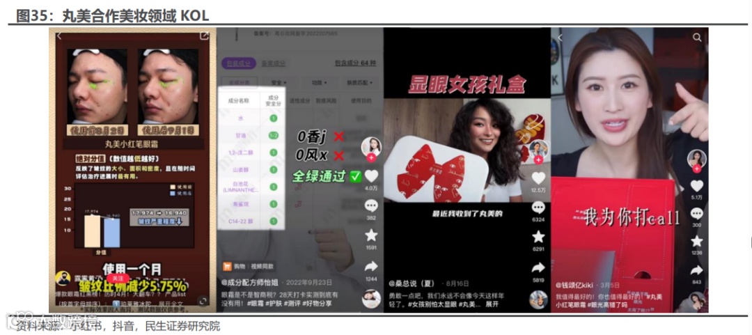 美妆KOL科普推荐,提升消费者对品牌的好感度。美妆护肤类KOL普遍拥有丰富的美妆知识与专业的甄别能力,更能直击消费者痛点,因此丸美积极与抖音、小红书KOL/KOC合作,通过产品开箱等方式进行产品“种草”,例如23年38节活动中,丸美合作美妆垂类博主九儿大魔王,以丸美产品试用、公关礼盒开箱的视频内容,展示产品的实际功效,完成粉丝种草。此外,丸美还合作精致的大姨夫、露露黄了、成分配方师怡姐等以成分测评为主要视频内容的KOL进行产品的科普种草,通过深入探讨眼霜成分,展现使用前后真实对比,加速消费者对产品的了解,逐步将互联网用户转化为品牌粉丝。