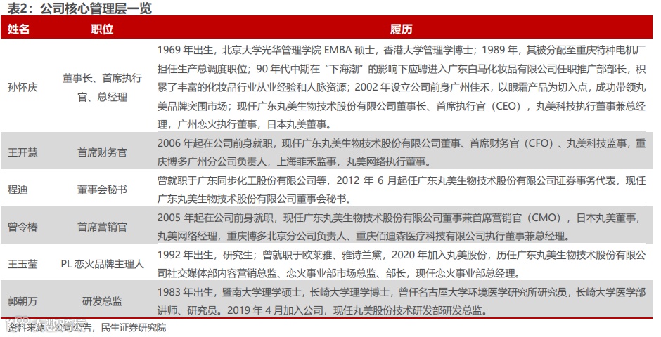 核心管理人员经验丰富,赋能公司实现长远发展。公司董事长孙怀庆先生自公司成立至今一直担任首席执行官职位,孙怀庆先生带领公司以眼部护理为突破口,逐步发展为国内眼部护理行业龙头企业;首席营销官曾令椿先生 2005 年加入公司,历任广州佳禾(公司前身)的区域经理、企划课长、市场企划部部长等职务,熟悉公司发展历程及各阶段发展情况,能够准确分析公司现阶段情况并制定有效的营销策略。恋火品牌主理人王玉莹女士曾就职于欧莱雅、雅诗兰黛等企业,曾操盘 MAC 、植村秀、欧莱雅等国际彩妆品牌,具有丰富的美妆行业工作经验,对美妆行业发展有较深的洞察力,有望赋能恋火品牌加速发展。