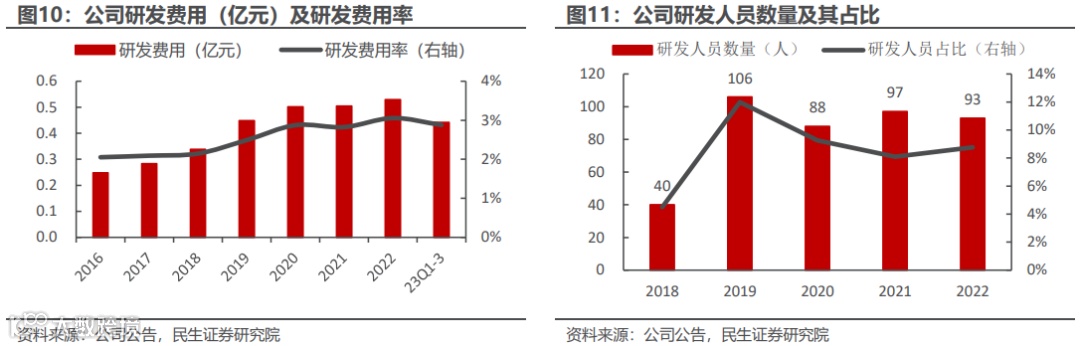 2)研发团队方面,公司不断引进高素质人才,组建高质量研发团队。2018-2022 年,研发人员数量从 40 人增至 93 人,研发人员数量占公司整体员工数的比例从 4.5%提升至 8.77%;22 年研发人员中硕士及以上学历占比已达到 30%,研发团队规模持续扩大且质量持续提升。