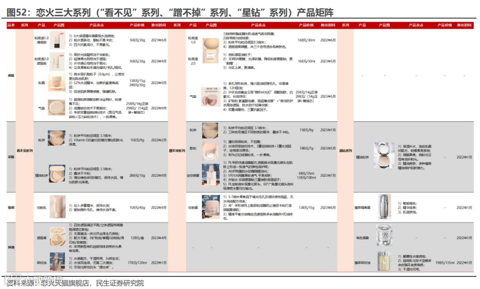 深耕底妆赛道,推出适用不同肤质的系列产品,满足消费者多元需求。截至目前,恋火旗下共有“看不见”系列、“蹭不掉”系列、“星钻”系列三大产品系列,其中“看不见”系列为干皮专研,主打看不见妆感、卡粉、斑驳,包含粉底液、气垫、粉霜、粉饼、妆前乳等产品;“蹭不掉”系列为油皮专研,主打轻薄、遮瑕、持妆,包含粉底液、气垫、散粉、粉饼、定妆喷雾、妆前霜等产品;“星钻”系列为线下专享系列,包含卸妆油、粉饼、面霜等产品。“看不见”系列和“蹭不掉”系列定价均处于100-300元区间,但两者产品的适用肤质错位互补;“星钻”系列定位高端,在价格带上对产品矩阵进行完善,使得恋火现有产品能够满足线上线下不同层级、不同肤质消费者多元需求。