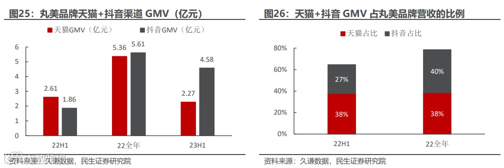 2020年发力线上渠道,把握电商渠道红利,同时注重提升线上渠道运营效率。2020年前公司渠道以线下为主,2019年线下渠道收入占比为55.11%;2020年电商业态加速发展,公司开始转型线上,大力发展电商板块业务,资源团队深度倾斜,优化渠道结构和运营效率。从20年3月更换丸美天猫旗舰店TP为美妆代运营龙头壹网壹创→21年自建超200人的电商团队发力线上自营→22年董事长直接带领推进线上转型→23年7月设立以天猫为代表的货架电商部、以抖快为代表的自播电商部和达播电商部,并配置专业的业务负责人及团队,丸美电商业务逐渐调整完毕,线上渠道运营效率逐步改善。根据久谦数据,23H1,丸美品牌天猫+抖音渠道 GMV为 6.86 亿元,同比增长 53.42%;天猫 +抖音合计GMV 占丸美品牌营收的比例从22H1的 64.43%提升至22全年的78.42%,线上业务收入及收入占比快速提升。