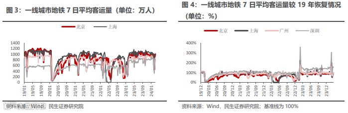 一线城市地铁客运量数据跟踪:截至2024年3月2日,一线城市北京/上海/广州/深圳七日平均客运量分别为994/1021/872/812万人次,分别恢复至2019年同期的89%/96%/93%/151%,深圳客运量恢复趋势最为明显,北京/上海/广州七日平均客运量尚未恢复至19年同期水平。