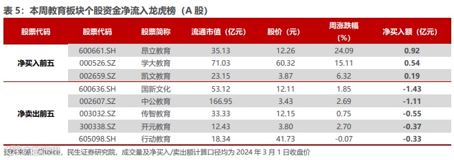 教育板块净卖出前五:国新文化(-1.43亿元)、中公教育(-1.11亿元)、传智教育(-0.55亿元)、开元教育(-0.37亿元)、行动教育(-0.33亿元)。