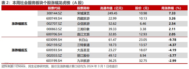 社会服务涨跌幅前五:宋城演艺(7.33%)、西藏旅游(3.26%)、众信旅游(2.54%)、三湘印象(2.11%)、曲江文旅(2.05%)。