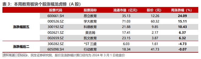 教育涨跌幅前五:昂立教育(24.09%)、学大教育(15.11%)、科德教育(10.43%)、美吉姆(6.37%)、凯文教育(6.32%)。