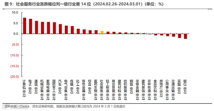 社会服务涨跌幅后五:长白山(-9.78%)、三特索道(-4.37%)、大连圣亚(-4.19%)、丽江股份(-3.77%)、九华旅游(-2.99%)。